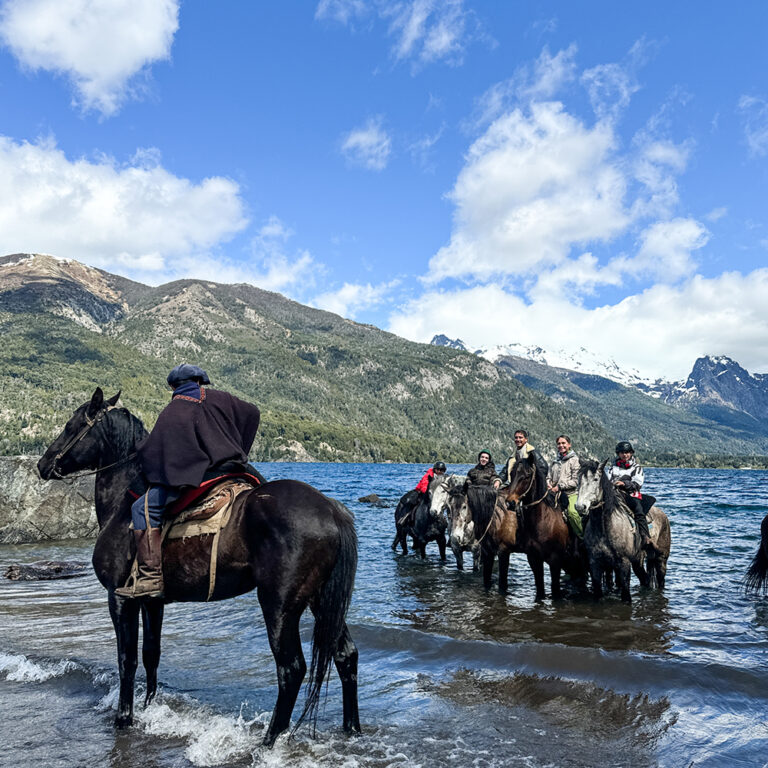 - LAGO MORENO: Partiendo desde nuestro campo, recorremos una zona poco poblada y, por caminos vecinales, llegamos hasta la playa este del lago Moreno. Cabalgamos por la playa hasta la desembocadura del río Casa de Piedra, el cual remontamos para luego emprender el regreso. Desde esta extensa playa, disfrutamos de una vista espectacular hacia los cerros López, Capilla, Bella Vista y Goye.