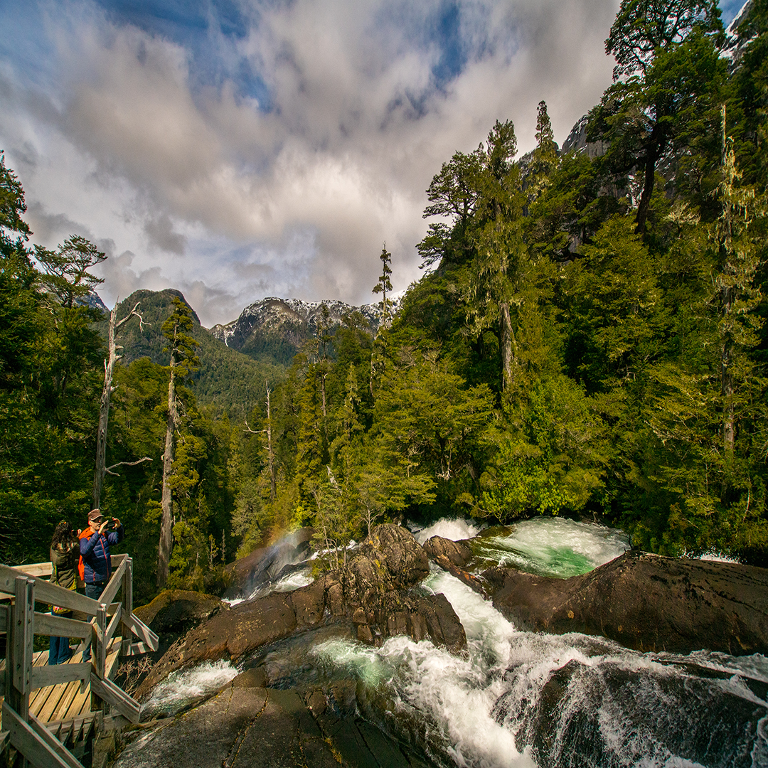 El primer destino es la imponente Cascada de los Cántaros. Subiendo por un sendero rodeado de exuberante vegetación perteneciente a la selva Valdiviana, se llega al Lago Cántaros, origen de la cascada. En este entorno se destaca un majestuoso alerce de más de 1.500 años de antigüedad, testigo vivo del paso del tiempo.